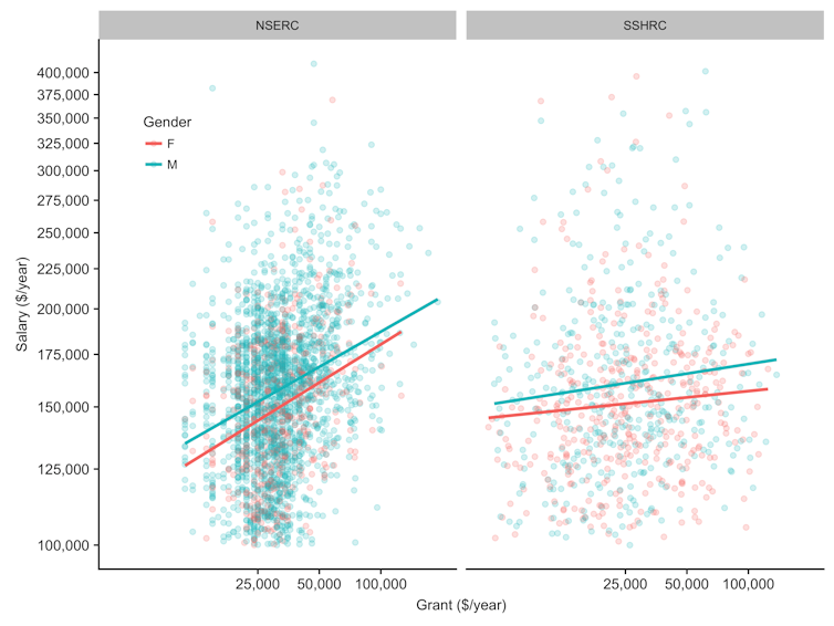 The results are publicly available from NSERC, as are Insight Grant awards from the Social Sciences and Humanities Research Council of Canada (SSHRC), making it possible to combine grant and salary data for thousands of Ontario professors. These data sets do not include gender, but computer programs can infer gender from first names with high accuracy. (I used gender in the programming language R.)