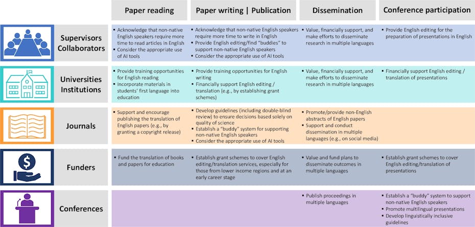 As a first step, journals could do more to provide English editing support to academics (as Evolution has started doing) and could accept multilingual publications (as the preprint server EcoEvoRxiv does).