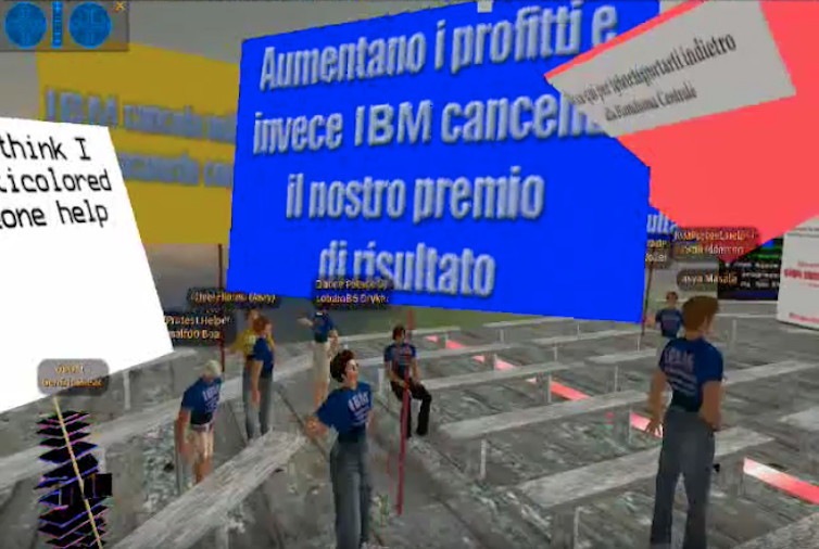The most novel use of the digital to protest has to go to Italian employees of the tech firm IBM back in 2007. Prior to the strike, IBM had decided to invest a significant sum on a headquarters in the virtual world Second Life, to be used not only as an advertisement for the company, but to actually host internal company meetings between executives stationed across the world. When the strike occurred, then, workers protested in both physical and digital space, with 1,850 protesting avatars storming the company’s virtual business centre. Teleporting in and out of virtual meetings, taking the form of geometric shapes, placards with legs, and a range of angry fruit, the workers succeeded in disrupting their bosses who were on the other side of the physical world.